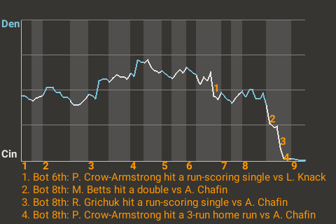The game was at a stalemate until designated hitter Randal Grichuk came to bat in the bottom of the eighth. Facing Denver pitcher Andrew Chafin, he hit a first pitch fastball for a run-scoring single. It was a game-changer, putting Cincinnati on top, 3-2.