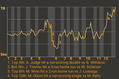 The game was at a stalemate until first baseman Matt Olson came to bat in the top of the 12th. Facing Seattle pitcher Merrill Kelly, he hit a 1-1 fastball for a run-scoring single. It was a game-changer, putting Tampa Bay on top, 5-4.