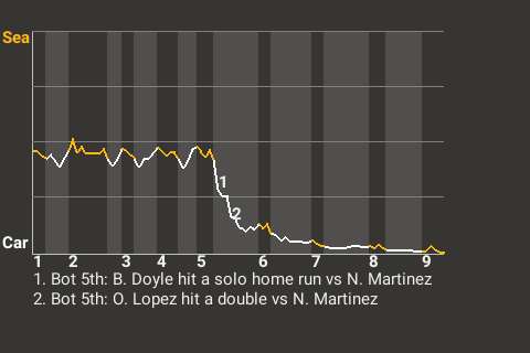 Brenton Doyle took Seattle hurler Nick Martinez deep in the bottom of the fifth. His solo home run put the Riptides on top, 1-0. In all, Doyle had 1 single in addition to the home run, while going 2 for 3.