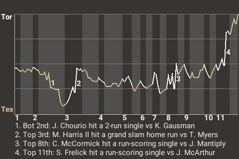 The game was at a stalemate until right fielder Sal Frelick came to bat in the top of the 11th. Facing Texas pitcher James McArthur, he hit a 2-2 curveball for a run-scoring single. It was a game-changer, putting Toronto on top, 7-6.