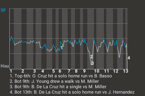 The decisive blow was delivered by Bryan De La Cruz in the bottom of the 13th when he hit a solo home run off 27-year old left-handed pitcher Jose E. Hernandez to win the game for Houston. The home crowd went nuts.