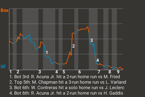 The San Francisco Dragons moved to within one game of the Round 3, downing the visiting Boston Minutemen at Pac Bell Park by a score of 10-7. Dragons right fielder Ronald Acuna Jr. did some major damage. He hit 2 home runs. He drove in 4 runs and scored twice. The win gives the Dragons a 2-0 advantage in the best-of-5 Round 2.