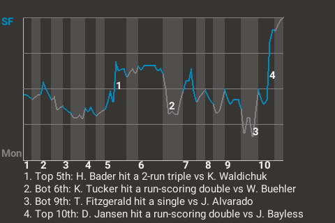 San Francisco took a 3-2 lead on Danny Jansen's 4th double of the season. The run-scoring double, which Jansen hit in the top of the tenth, left Montreal pitcher Jarod Bayless visibly frustrated.