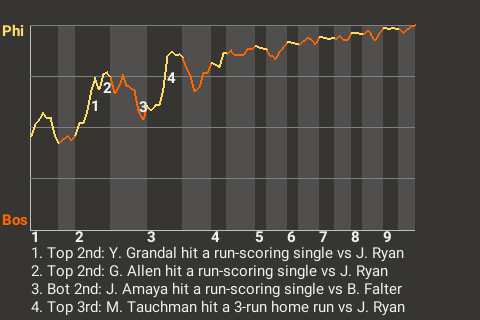 With Philadelphia leading 3-2 in the top of the third, Tauchman hit a changeup from Joe Ryan for a 3-run home run. It was his 15th home run of the season and put the Phalanx ahead, 6-2.