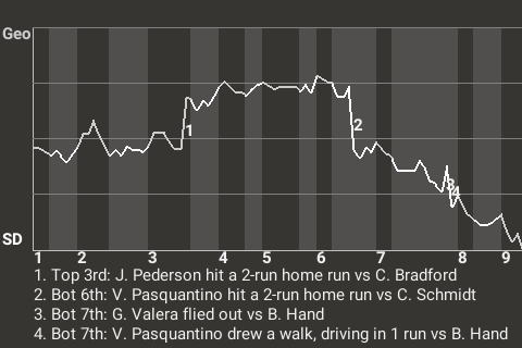 Vinnie Pasquantino went 1 for 3 with a home run and a walk, while adding 3 RBI and scoring once for San Diego. The 26-year old first baseman had a key at-bat in the bottom of the seventh. With two out and the bases loaded, he broke a 2-2 tie with a run-scoring walk off Brad Hand. It was his 38th walk of the season.