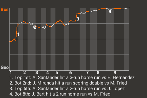 Early in the game, Santander had a 3-run home run for Boston. It was his 42nd home run of the season and put the Minutemen on top, 3-0.