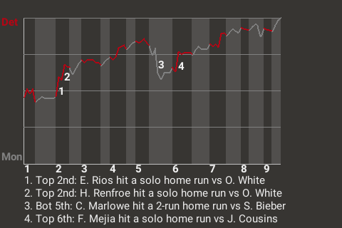 Francisco Mejia had a big solo home run for the Demons in the top of the sixth inning. With Detroit leading 3-2 and the bases empty, he sized up a changeup from 30-year old right-handed pitcher Jake Cousins and punished it. The result was his 9th home run of the season, which put the Demons on top, 4-2.