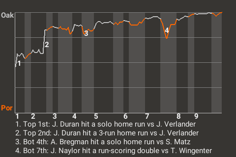 With Oakland leading 1-0 in the top of the second, Duran hit a changeup from Justin Verlander for a 3-run home run. It was his 32nd home run of the season and put the Roses ahead, 4-0.